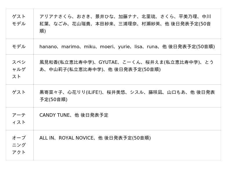 楽曲「倍倍FIGHT!」や「キス・ミー・パティシエ」が大ヒットを飛ばし、話題沸騰中の7人組アイドルグループ・CANDY TUNEのステージ出演をはじめ、女性ファッション誌『Ray』からも、読者モデルから専属モデルに史上初昇格した中川紅葉、歴代最年少の15歳での加入となった北里琉を新たに加えた専属モデル6名の出演が決定しています。