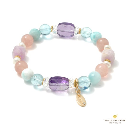 ピンクと紫、水色が上品なグラデーションと、柔らかなホワイトトーンのブレスレットは、天然石のエネルギーをしっかりと感じながら、おしゃれに身に着けたい方に最適なデザイン。