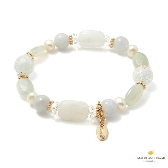 透明感と清らかさを感じさせるムーンストーンや白翡翠、淡水パールやクラック水晶が、穏やかさと澄んだエネルギーをもたらすブレスレット。