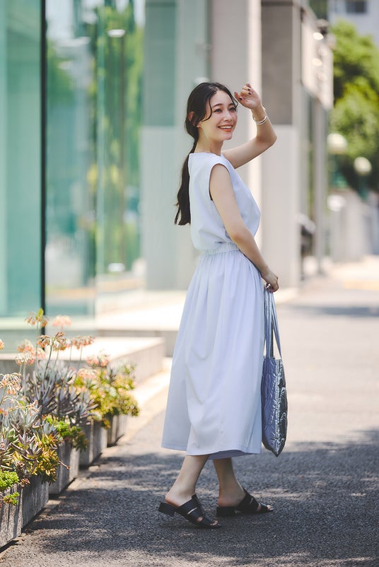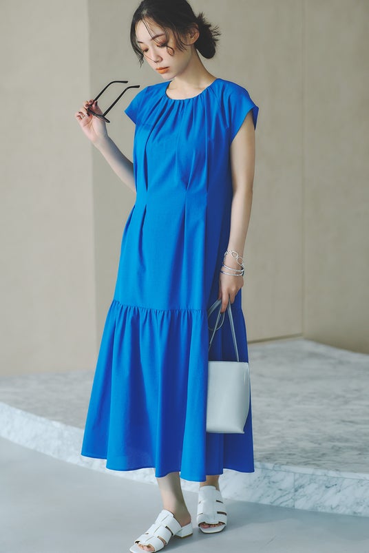 ・デザイン: タックやギャザーで立体感をもたせたワンピース。フィットしすぎることなく程よく身体に寄り添い、女性らしいフェミニンさを保ちながら快適さも叶うシルエットです。