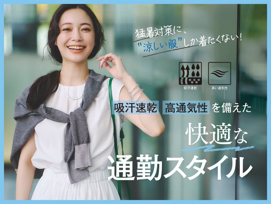 暑さや汗などの悩みを快適に解消し、清涼感のあるエアリーな着心地の機能性アイテムの着こなしを、シーン別でご紹介した特集ページでぜひご覧ください。