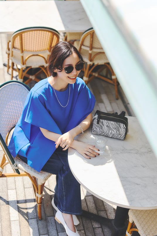 ・デザイン:自然に生まれる腕周りのラッフルが、気になる二の腕をカバーしてくれるデザインのブラウス。デニムやテーパードパンツと好相性です。