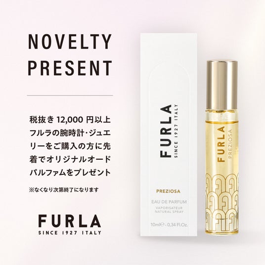 時計販売店/WORLD WIDE WATCH にてFURLA(フルラ)の腕時計・ジュエリーを12,000円(税抜き)以上ご購入いただいた方に先着でオリジナルオードパルファムをプレゼントいたします。