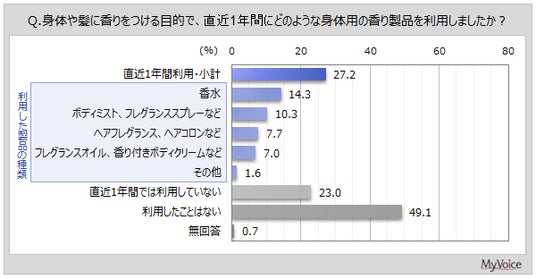 利用した種類は(複数回答)、「香水」が14.3%、「ボディミスト、フレグランススプレーなど」が10.3%です。