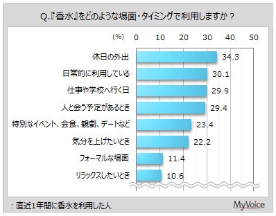 直近1年間に『香水』を利用した人の利用場面は(複数回答)、「休日の外出」が34.3%、「日常的に利用」「仕事や学校へ行く日」「人と会う予定がある」が3割前後です。