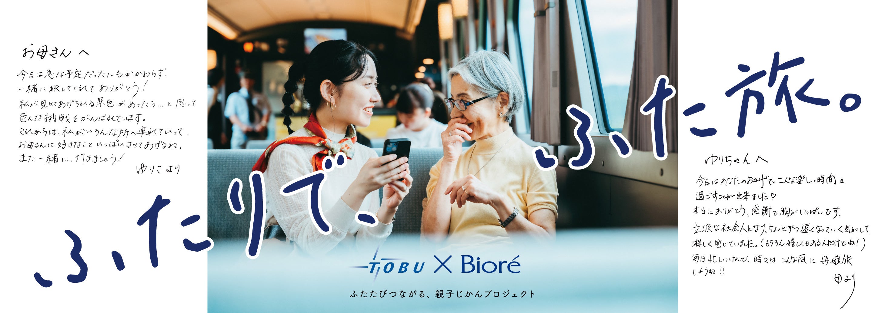 花王株式会社のスキンケアブランド「ビオレ」は、東武鉄道株式会社と協働し、“もう一度、母と娘で出かけたくなる旅”をテーマにしたプロジェクト「ふたりで、ふた旅。」を始動します。2025年11月7日(金)より交通広告の展開を開始し、9月に実施した「東武特急スペーシア Xで行く 日光日帰りツアー」に参加した親子のポートレートを起用。旅を通じて生まれた親子の絆や笑顔を通し、プロジェクトに込めた想いを発信します。