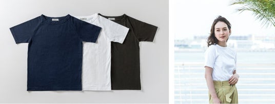 今回新色が登場するのは、飽きのこないベーシックなシルエットと着心地の良さで、発売以来ご好評をいただいている「ムラ糸クルーネックTシャツ」。綿花から糸を作る過程で生まれる、通常は廃棄される不揃いな“落ち綿”を再利用したサステナブルなアイテムです。ムラ糸で編まれた生地は、表面の自然なムラ感が生み出す豊かな表情に加え、高い耐久性を持ち、洗濯を重ねることで味わいが増していく経年変化も魅力のひとつ。トレンドに左右されず、長く着るほどに愛着が増していきます。エジプト綿やスーピマ綿と並び世界三大コットンのひとつと称されるトルファン綿を使用し、まるでシルクのような光沢と、しっとりなめらかな肌触りを実現しました。