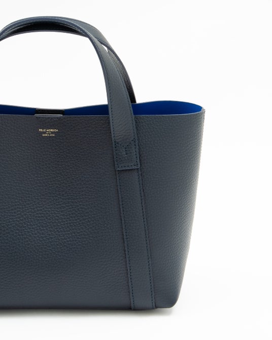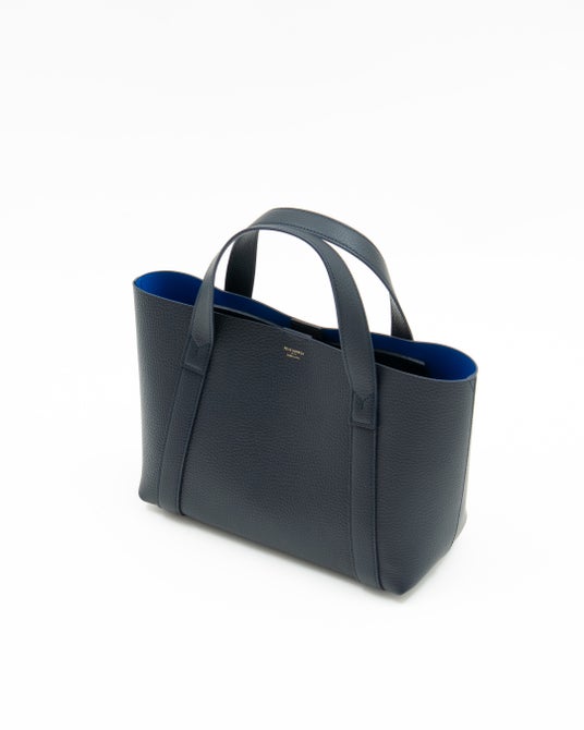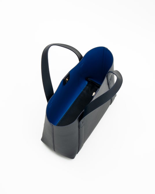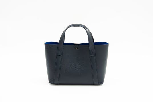 人気のミニトートバッグをベースに、外側はネイビー、内側はブルーで仕上げたダブルフェイスレザーを使用しました。