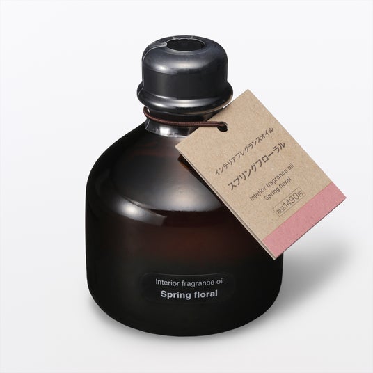 「インテリアフレグランスオイル スプリングフローラル」 100mL/200mL 税込1,490円/2,290円ボトルに別売りのラタンスティックをさし込むだけで手軽に香りを楽しめます。