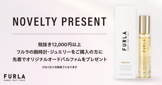 時計販売店/WORLD WIDE WATCH にてFURLA(フルラ)の腕時計・ジュエリーを12,000円(税抜き)以上ご購入いただいた方に先着でオリジナルオードパルファムをプレゼントいたします。