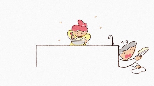 はじめてのパンケーキ作りを通じて、日々訪れるこどもの“はじめて”は、親にとっても愛おしい“はじめて”の連続であることを、椎名林檎さんのデビュー曲「幸福論」と共に描きました。父がキッチンでパンケーキ作りをしていると、「私もやる!」と意気揚々と娘がやってきます。はじめて料理に挑戦する娘は、卵を手に取って勢いよくボウルの角にぶつけて卵を割ります。勢いの良さに慌ててボウルを押さえる父は、ちょっと心配そうな面持ちで苦笑い。一方の娘は、次々と材料をボウルに入れて、はじめての料理を楽しんでいる様子。父が牛乳をいれようと、少し目を離した隙に、勝手に粉を勢いよく入れる娘。粉けむりがもくもくと舞い上がり、ケホッとする父。けれどもそんなことはおかまいなしに、娘はボウルを力強く混ぜ合わせます。左へ右へと飛び散る粉に合わせて、床をあちこち拭いていく父。娘は満足げにちょっといびつな形のパンケーキを次々と完成せる姿を、父は床を拭きながらもうれしそうに見守っています。娘に振り回されながらも、さまざまな“はじめて”を経験して一緒に成長する親子の日々を描きました。ちょっとした失敗やハプニングすらも愛おしく感じてしまう、そんな”家族愛”を伝えます。
