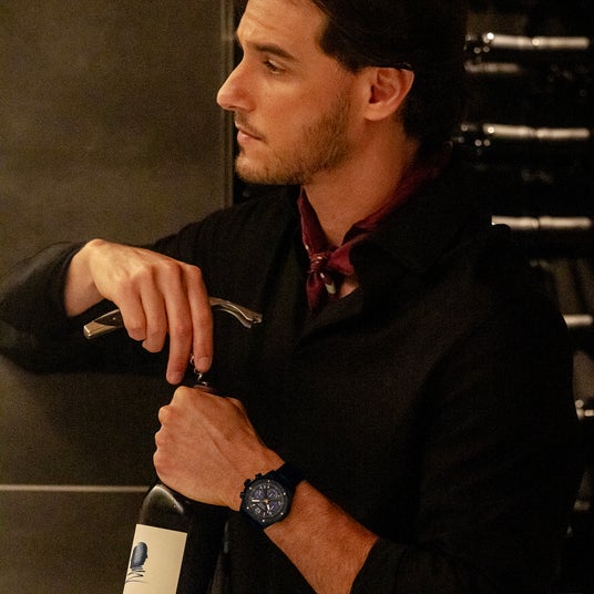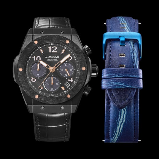 ブラックを基調にしたカーボンベゼルも。カーボンベゼルとブラックケースを組み合わせたEXVENTURE SOLARが公式オンラインショップ限定で登場。精悍なオールブラックの世界観に、光の角度で表情を変えるカーボン特有の質感が加わることで、スポーティかつ先進的な印象を放ちます。 通常モデルのゴールドケースとは一線を画す、引き締まったタフネスデザイン。都会のストリートからアクティブシーンまで、幅広くマッチする限定仕様の一本です。また、公式オンラインショップ限定に限り、ブルーの阿波藍染レザーストラップが付属します。日本一の藍染料の産地である徳島県で染色された阿波藍の革であり、“至高の青”として世界に知られるほど深く鮮やかな色合いが魅力です。