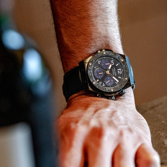 丁寧に磨かれたヘアラインとポリッシュが切り返すケースのベゼルには、6本のビスが主張。正面でもサイドから見ても力強いルックスは一目瞭然。
