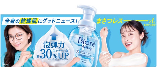 こうした背景を踏まえ、「ビオレ ザ ボディ 泡ボディウォッシュ」は、全身の乾燥肌に向けた改良を行います。香りタイプは泡弾力を約30%*2 アップさせた“新・ツノ立ち生クリーム泡”を採用。肌へのまさつを抑えた“まさつレスな手のひら洗い”のスタンダード化を、さらに推進してまいります。