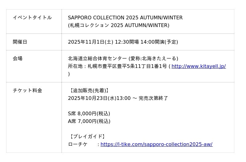 北海道最大級のファッションイベント『SAPPORO COLLECTION 2025 AUTUMN/WINTER』(略称:サツコレ2025AW)が、2025年11月1日(土)に札幌市豊平区の北海きたえーる(北海道立総合体育センター)にて開催されます。