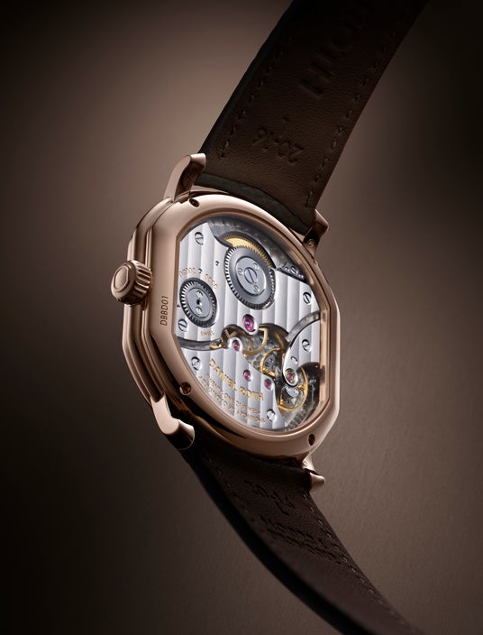DR002の外観にも、その魅力と手触りをさらに高めるため、細心の注意が払われました。単一の部品として手作業で作られた巻き上げ爪は、ムーブメントの視覚的な美しさを高めるだけでなく、ムーブメントの巻き上げ時の満足感ある正確な手触りにも貢献。キャリバーDR002の魅惑的な美しさは、洗練された装飾と伝統的な構造を明示するオープンケースバック越しに際立ちます。