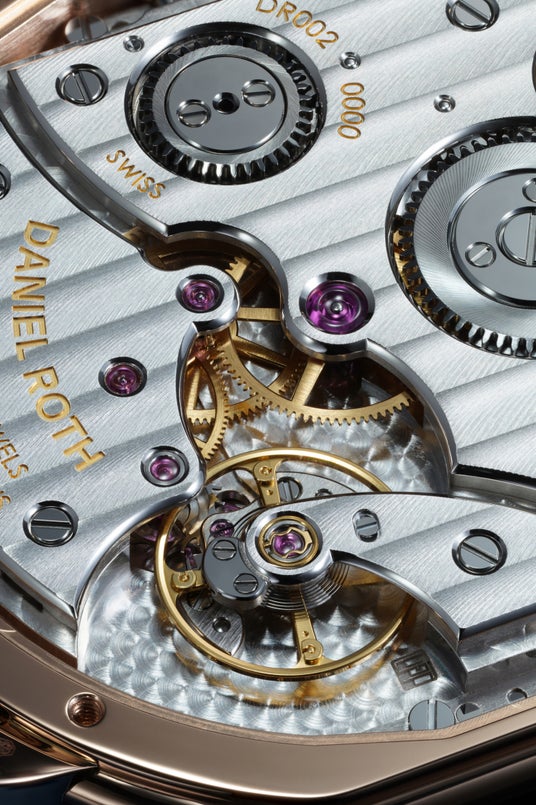 ロート氏とスイスのハイウォッチメイキングの伝統に敬意を払うべく設計されたムーブメントDR002は、マスター・ウォッチメーカーのミシェル・ナバスとエンリコ・バルバシーニが手掛けたもの。DR002は、トゥールビヨン・キャリバーDR001の独特な視覚的スタイルを保ちつつも、「エクストラ プラット コレクション」向けに一から開発されたものであり、今後の複雑機構のためのベースムーブメントの役割を果たします。