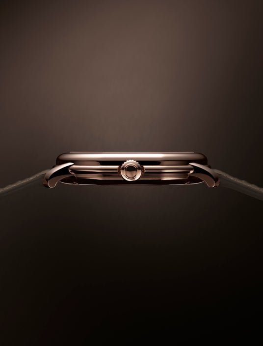 5Nローズゴールドのケースは、オリジナルデザインを尊重しながらも、アイコニックなダブルエリプスのシルエットを保ち、中央にひだ装飾を施して均整の取れたバランスを実現。より緩やかなカーブと下向きのアングルに再設計されたラグは、より快適なフィット感をもたらします。