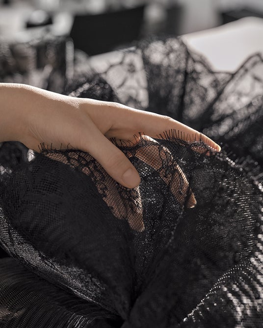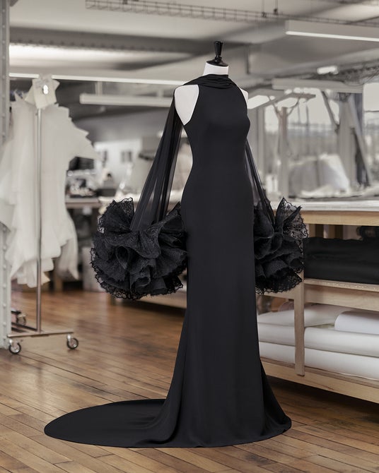 ケイト・ブランシェットが着用したシルククレープホルターネックドレスは、ブラックのリパーパスド生地から再構築されたフリルレースがあしらわれた、シルクオーガンザのマキシスカーフが添えられています。
