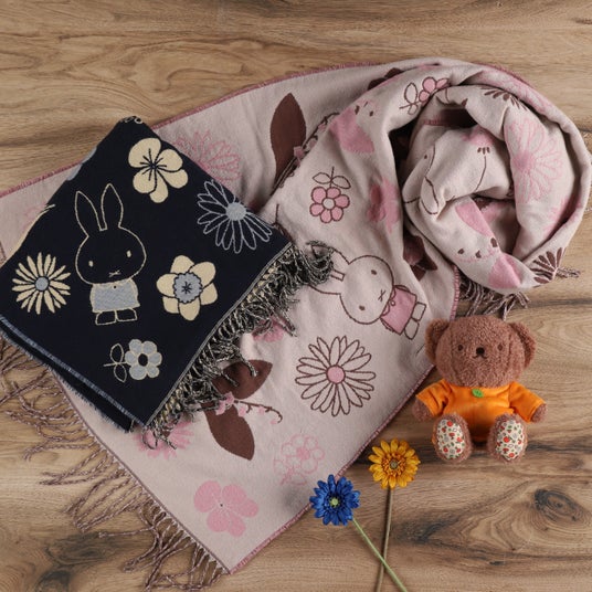 同日より販売する、「Flower Miffy ストール Flower Bloom」は、大人っぽい色味が普段使いにぴったりの「ネイビー&アイボリー」と「ピンク&ブラウン」の2色展開。厚手の生地は、さらっと羽織ってアウターとして使用するほか、ソファやベッドなどに掛けてインテリアのアクセントにするのもおすすめです。