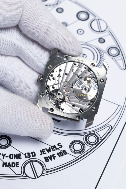 ブルガリならではの独創性と高い精度によって、デザインとサイズのバランスについての新しい定義が実現されました。ケース径40mmの「オクト フィニッシモ」搭載ムーブメントより0.12mm厚みが増すものの、ムーブメント全体の体積は約20%削減されました。ブルガリが「セルペンティ」のために開発したBVP100 ピコリッシモキャリバーとBVS100 レディ ソロテンポが、この新ムーブメントの誕生へと繋がりました。「オクト フィニッシモ」ケース径37mmは、不可能を可能にするスピリット、つまり革新的なクリエイティビティと妥協を許さない専門的技術の融合から生まれたウォッチであり、すべてを新たに考案して開発されました。組立後の重量は約65gと、かつてないほどに快適な着け心地をもたらします。