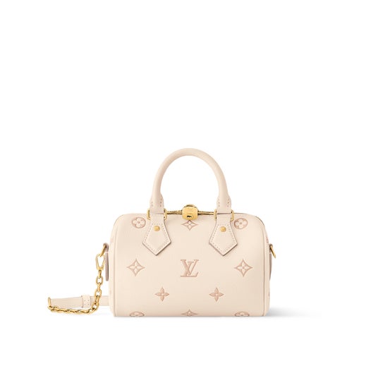 「スピーディ・バンドリエール 20」は、メゾンを象徴するゴールドカラーのパドロック(錠前)と取外し可能なチェーン付きで、内装にはストライプのライニングをあしらいました。毎日の必需品を収納できるサイズで、手持ちや斜め掛けにしても楽しめます。