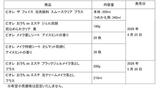 第1弾として重曹*1 配合の洗顔料『ビオレ ザ フェイス 泡洗顔料 スムースクリア プラス』 (本体・つめかえ用)、メントール*2 配合のメイク崩れ対策シート『ビオレ メイク直しシート』 『ビオレ メイク持続シート さらマット肌続く』を2026年4月25日より限定発売します。