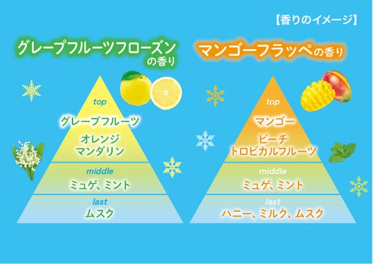 また、外装パッケージには、氷やフルーツのしずる感あふれるビジュアルを使用し、ひと目で冷たさとフレッシュな香りが感じられるデザインとしました。また、内装パッケージには、使用時にも香りを連想できるよう、モチーフであるフルーツやドリンクのアイコンをあしらっています。