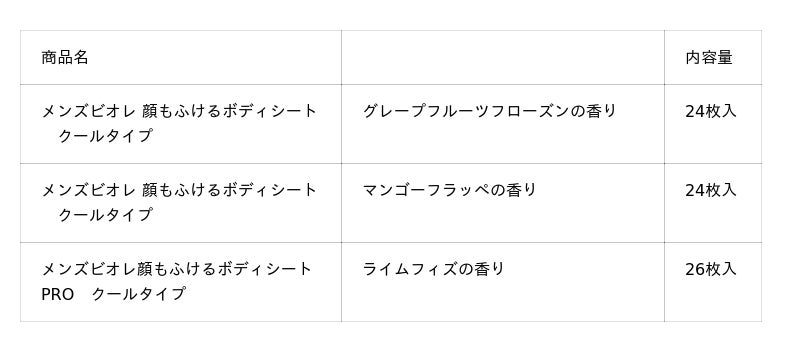 今年は、「顔もふけるボディシート」から、クールタイプのすっきり爽やかな「グレープフルーツフローズンの香り」と、みずみずしくトロピカルな「マンゴーフラッペの香り」を発売いたします。いずれの香りも、シートで拭いた瞬間に、フローズンドリンクを口にしたようなひんやりした気持ちよさと爽快感が広がることをイメージしてつくりました。男性はもちろん、女性にも手に取りやすいよう、軽やかで親しみやすい香りに仕上げています。