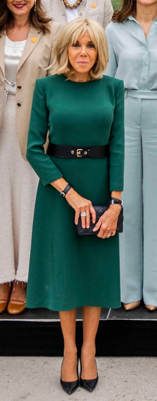 ブリジット・マクロン仏大統領夫人は、スリークォータースリーブのグリーンのシルククレープドレスにブラックレザーのベルトを合わせました。