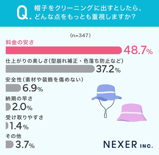帽子をクリーニングに出す際に最も重視されるのは「料金の安さ」で48.7%と約半数に迫ります。
