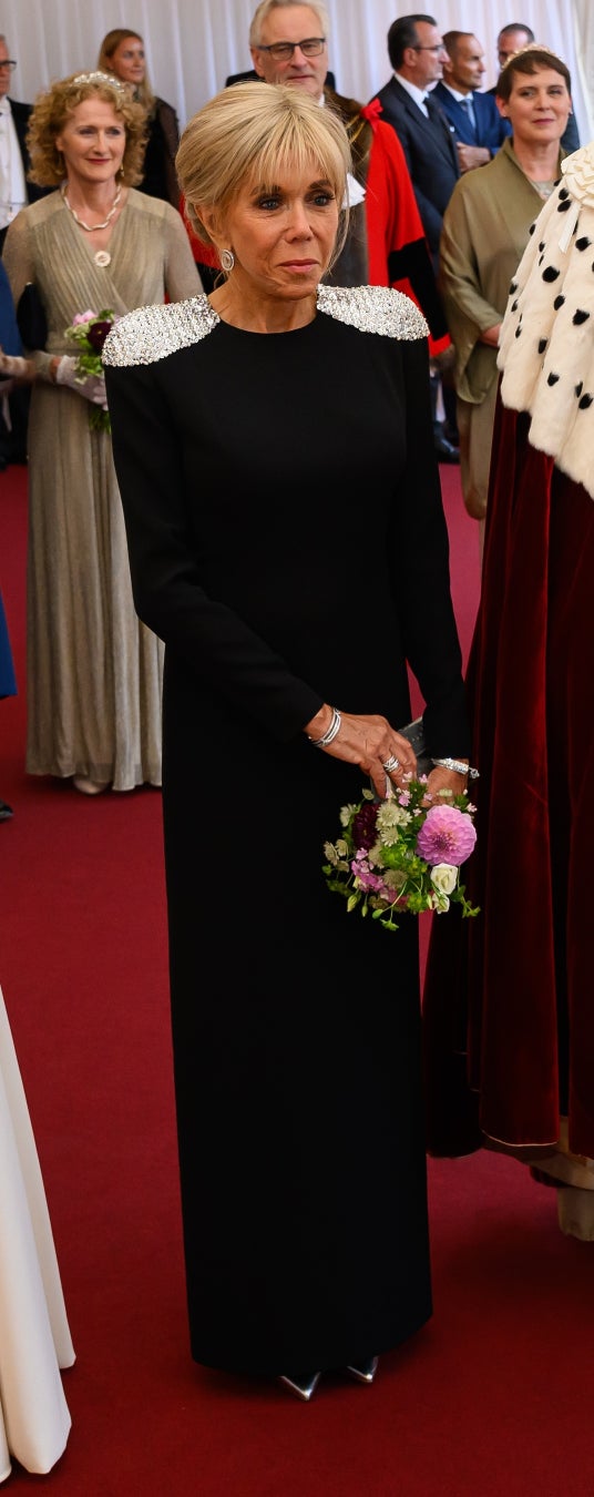 ブリジット・マクロン仏大統領夫人は、シルバーのスパンコールが手刺繍されたロングスリーブで構築的なショルダーが特徴的な、ブラックのシルククレープコラムドレスを纏いました。