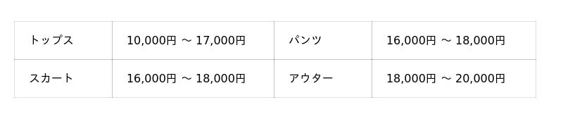 価格帯(参考) ※以下は2026年春夏シーズンの参考価格となり、表示は税別です。