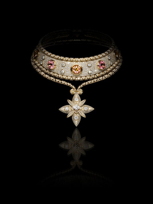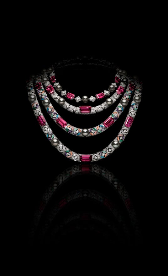 色彩とクリエイティビティから生まれる勢いが、アーティストを、新たな光に満ちたビジョンと悟りの道へと導きます。解き放たれたクリエイティビティは、輝きの源、鮮やかな光輪、そしてその旅路を導く力強く変幻自在なオーラとなります。クリエーションを通して進化し続ける「Aura」もまた、メゾンが導きの星として毎年再考し、再定義しているシグネチャーのモノグラム・フラワーを取入れたデザインを展開。「Virtuosity」コレクションによる再解釈は、合計48.06カラットのブラッシュトーントルマリンが美しくセッティングされた現代的でこの上なくフェミニンな若々しいデザインで表現されています。3種類のスタイリングを楽しむことができる変形可能なネックレスには、イエローゴールドとホワイトゴールドのベースに、ピンク、ピンキッシュオレンジ、オレンジピンクのトルマリンをセッティング。天空に輝く星のようなモノグラム・フラワーのペンダントが揺れ、その頂点には同色の2.31カラットのLV モノグラムフラワーカットダイヤモンドがきらめきを添えます。