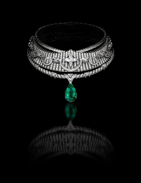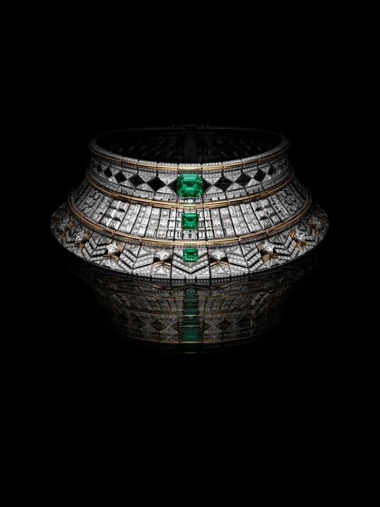 壮大な建築物が石を1つ1つ積み上げて造られていくのと同様に、最高の熟練技もまた、究極の完成を目指して忍耐強く積み重ねられていきます。絶対的な技術に到達し、頂点を極めようとするこの大志を体現するもう1つの作品が、建築的な構造が印象的なハイカラーネックレス。ホワイトゴールドにピンクゴールドをあしらった大胆でモダンなキューバンチェーンをアクセントに、現代性と伝統的なジュエリー製作のサヴォアフェールが巧みに融合した精緻な構造を通して、ダミエ・パターンが再解釈されています。異なるストーンが織りなす、魅惑的なハーモニーの中に浮かび上がるのはダミエ・パターン。交互に配されたダイヤモンドと巧みに織り交ぜられた84石のカボションカットエメラルドや、さらには、156石のカスタムカットのオニキスと共にネックレスのラインを縁取る20石のルビーなど、すべてのエレメントが見事なハーモニーを奏でながらネックレスの構造体を支えています。軽やかさの錯覚を生み出すこのジュエリーは、2,400時間の作業を経て完成。12.85カラットのカボションカットのザンビア産エメラルドと2.59カラットのオーストラリア産ブラックオパールで飾られています。