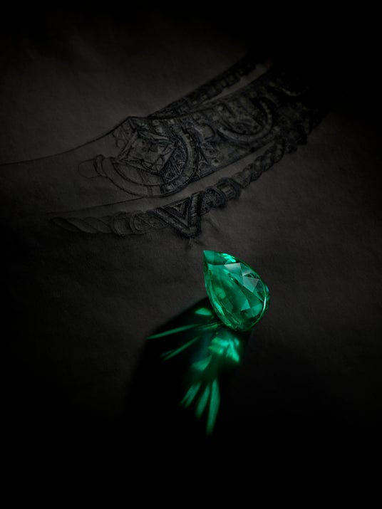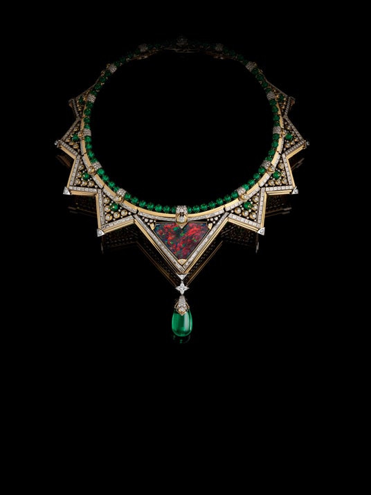 聖なる知識の秘密が閉じ込められているかのような、見る者を恍惚とさせる魅惑的なネックレスには、30.56カラットのトライアングルカットのオーストラリア産ブラックオパールをセッティング。レッドと鮮やかなグリーンが対話するユニークな色合いを有するオパールは、その魅惑的な力で、もう1つのストーン、28.01カラットの見事なドロップシェイプのエメラルドへと視線を引き寄せます。大胆な幾何学模様とグラフィックなデザインが特徴のこのクリエーションは、完成までに1,500時間の作業を要しました。トライアングル・モチーフは、トランクの角ばったコーナーや、釘を模したクローズドセッティングのダイヤモンドなど、ルイ・ヴィトンのトランク製造業者としてのサヴォアフェールを彷彿させる他のデザイン要素にも反映されています。