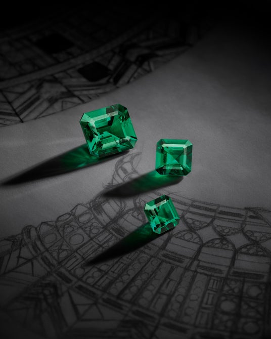 ノウハウが保護され安全であれば、知識は自然とその門戸を開け、秘密が明かされていくでしょう。「Maestria」は、アーティストが絶対的な技術の習得へと一歩ずつ近づきながら、器用さと厳格さ、正確さと卓越性を身に付けていく修業の過程と大志を表現しています。この努力とディテールへのこだわりを体現しているのが、ルイ・ヴィトンのハイジュエリーを象徴する2つの素材、ホワイトゴールドとイエローゴールドをミックスした大胆なハイカラーネックレス。建築学と幾何学の卓越した技能と知識が融合した傑作です。8.88カラットのストーンを筆頭に、調和の取れた色彩を放つ稀少で見事なコロンビア産エメラルド3石がクリエーションを飾ります。カスタムカット276個を含むダイヤモンド3,593個がセッティングされたネックレスは、メゾンならではのシグネチャーである「V」モチーフ、シェブロンパターン、アイコニックなダミエ・パターンが輝き、さらにオープンワークデザインで囲まれたカイト・モチーフが存在感を放ちます。