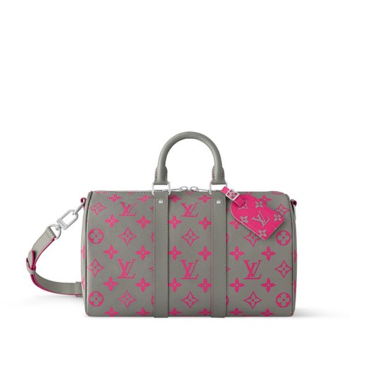 陽気な雰囲気の「キーポル・バンドリエール 25」。カラーを反転させたモノグラム・キャンバスの取外し可能なネームタグが視覚的なアクセントを添えます。トップハンドルや取外し & 調節可能なショルダーストラップで持ち運べるコンパクトなバッグ。