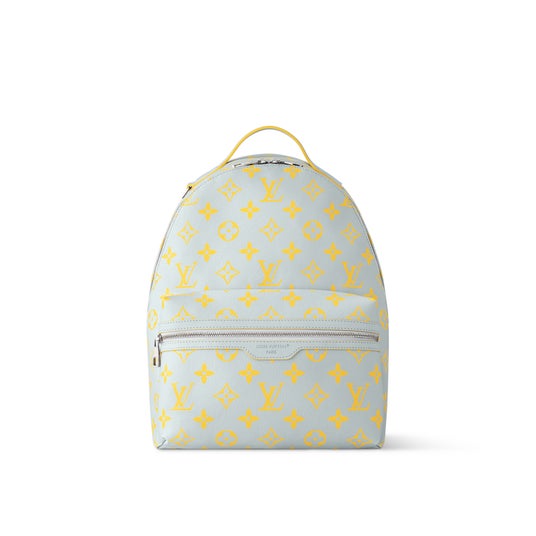 鮮やかな印象をもたらす「ディスカバリー・バックパック」。トリミングに施されたコバ染めやカラフルなテキスタイルライニング、カラーが反転したモノグラム・グロウ パターンのネームタグがデザインを引き立てます。内外に複数のポケットを備えた、デイリーに活躍するアイテム。
