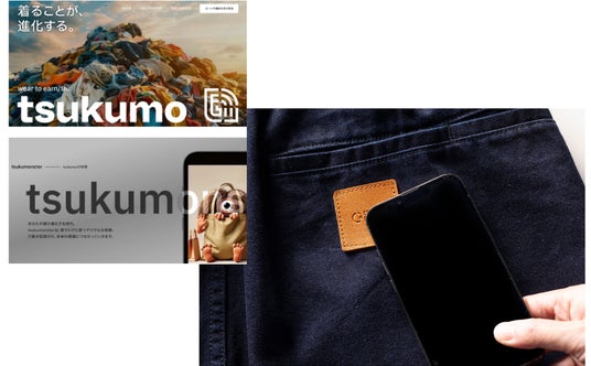 さらに、「着て、洗って、育てる」というデニムならではの楽しみを、最新技術によって再解釈。服をデジタル連携させ、さまざまな価値を提供するサービス「tsukumo」(株式会社MILKBOTTLE SHAKERS)とどこよりも早く連携。ヒップにあしらわれたレザーパッチにはICタグが埋め込まれており、スマホをかざすとWEB上の特設ページが立ち上がります。