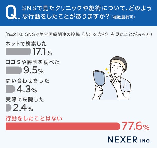 SNSで美容関連の投稿を見かける方は多いものの、77.6%が行動したことがないと回答しており、情報を見ても受診にはつながりにくい実態が明らかになりました。
