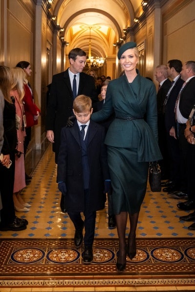 イヴァンカ・クシュナーは、オートクチュール コレクションから、ムッシュ ディオールのデザイン 「Favori AH1950 」にインスパイアされたグリーンのカシミアジャケットとスカートを纏いました。また、ディオールハット、ブラックの「レディ ディオール」のスモールレザーバッグ、同色のレザーグローブ、ベルト、シューズを合わせ登場しました。