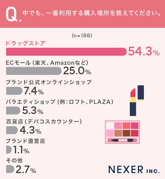 54.3%が「ドラッグストア」、25%が「ECモール(楽天、Amazonなど)」と回答しました。
