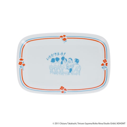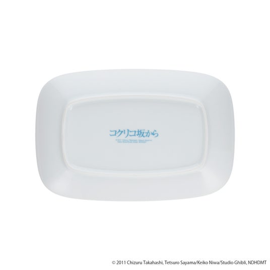 『コクリコ坂から』のオープニングで描かれる、主人公・海の家「松崎家」の朝食風景をデザインしたスクエアプレートです。作品の時代背景に合わせてレトロな白い陶磁器の素材を採用し、くすんだブルーとオレンジのカラーでデザインしました。ハムエッグやサラダを乗せて家族で食卓を囲めば、作中のワンシーンを再現できます。