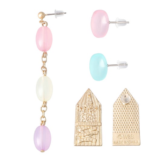 バーティー・ボッツの百味ビーンズのパッケージデザインを落とし込んだプレートピアスや色とりどりのビーンズを再現したゆらゆら揺れる三連ピアス、つるっとした質感がかわいらしいグリーンとピンクの一粒ピアスとのセットアイテムです。コーディネートに合わせて、ゴールドのモチーフが印象的な百味ビーンズプレートピアスを使用したりポップな印象のビーンズを組み合わせたりと、気分やシーンに合わせて多様な楽しみ方ができます。