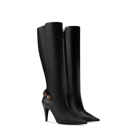 スムースレザーを使用した「レガシー ブーツ」。ルイ・ヴィトンの旅の伝統から着想を得たキーディテールとして、トランクのハンドルを想起させるモノグラム・キャンバスのストラップをあしらいました。刻印入りのメタルスタッズが洗練された印象を引き立て、ハイヒールと上質なレザーのアウトソールで仕上げられたアイテム。