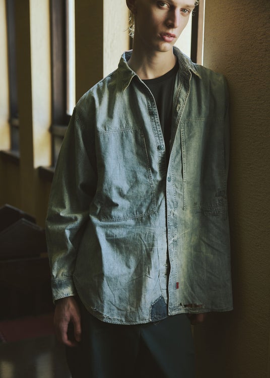 国産インディゴシャンブレーを使用し、両脇マチ付きのワークシャツに大きめのミリタリーポケットを配置。岡山の工場による巻き縫い製法で仕上げ、アナクロノームのシグネチャーカラーである赤のアクセントを各所に施しています。加工内容:ライトオンス当て布の手縫いステッチ+ストーンバイオブリーチ+特殊脱色による複合加工。
