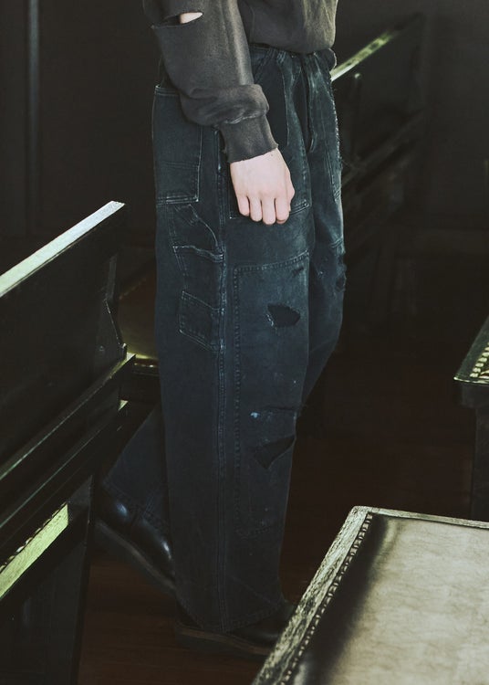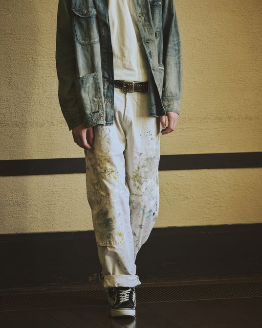 ワークパンツの定番であるペインターパンツをベースに、実際のペインターが長年の作業を通じて蓄積したような、リアルなペンキ痕を再現。タフな素材と、ヴィンテージライクな風合いを生み出す加工技術が融合した、存在感ある一本に仕上がっています。