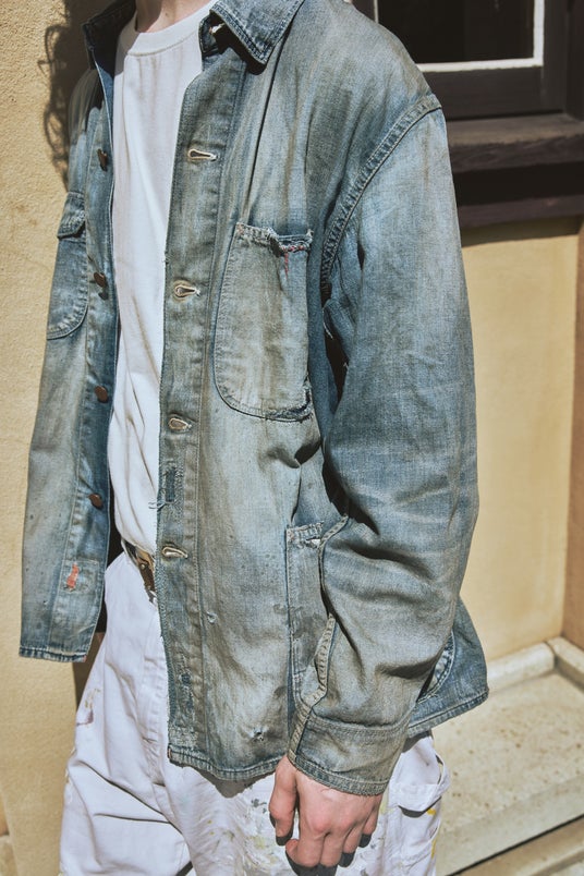 ハードなウォッシュ、繊細な脱色、職人によるダメージ&リメイク、そしてオリジナルの顔料スプレー仕上げにより、鮮やかなインディゴが際立つ唯一無二のカバーオール。