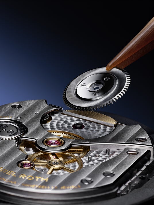 ダニエル・ロートの哲学を踏まえ、DR001の206個の部品は1つ1つ手作業で仕上げられます。ダイアルの下に隠れている部品でさえ、人目につくものであるかのように装飾されています。こうした部品は製造工程以外では人の目に触れないとはいえ、その熟練の職人技は、巻き上げや設定の際に、時計愛好家の指先の感触を通して自ずと伝わります。